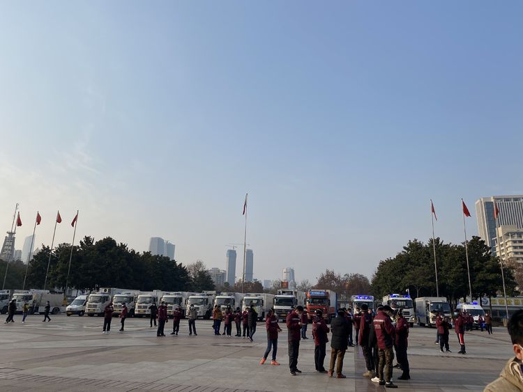 2月5日下午四点,接到通知前往江汉方舱医院参观,到达工作现场后,气氛紧张,来自全国各地的医护人员,安保警察,建筑工人,全国各地支援物资装备的车辆在广场上来往穿梭,马不停蹄的开展工作。