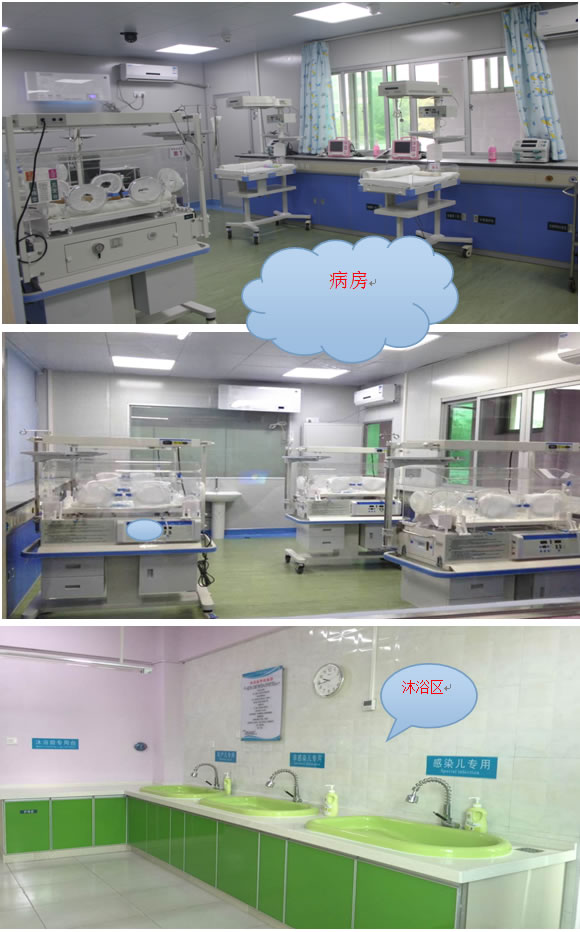 我科经全面装修改造后病区洁污布局合理,环境更加美观、整洁、舒适,目前开放床位30张,设有新生儿重症监护病室(NICU)、早产儿病室、感染病室、非感染病室、隔离病室、配奶室、治疗室、婴儿沐浴室(配有中央水温调控热水器)等。同时拥有一批先进的新生儿重症监护硬件设备,如中央生命体征监护仪、新生儿呼吸机、新型鼻塞CPAP呼吸机、多台参数监护仪、微量血糖监测仪、多台婴儿辐射抢救台、日本进口高级经皮测胆红素测试仪、多功能新生儿恒温箱、多功能(单、双)微量输液泵、输血泵、双面蓝光治疗仪和婴儿高压氧舱等。