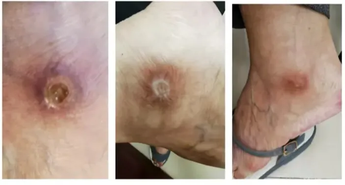 入院后,科室团队经细致查体与风湿疾病全套检查,明确诊断为 “系统性硬化症(局限性)、相关性足部难治性溃疡、2 型糖尿病、心律失常”,并定制 “精准化 + 人性化” 方案:医疗上用抗风湿、抗纤维化、扩血管药物,结合敏感抗生素与专业清创换药;护理上每日翻身按摩、指导功能锻炼,还安排心理辅导缓解其焦虑。